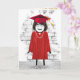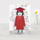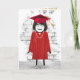 Cute stick figure girl with hair, graduation diploma, red gown, pearl necklace, sneakers, and a red cap for graduate congratulations.