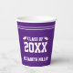 These royal purple and white graduation paper cups say 'Class of 2023' in large white text. (You can change the year if necessary.) At the bottom, there's white display text you can change to show the correct name for the graduate. White graduate's caps are on either side of the phrase "Class Of".