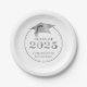 Elegant personalised graduation CLASS OF 2025 graduation party paper plates featuring faux metallic silver graduation cap and year with your custom text (shown with CONGRATULATIONS NAME) in black. ASSISTANCE:  For help with design modification or personalisation, colour change, resizing, transferring the design to another product or if you would like coordinating items, contact the designer BEFORE ORDERING via the Zazzle Chat MESSAGE tab or email makeitaboutyoustore@gmail.com.