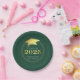 Elegant personalised graduation CLASS OF 2025 graduation party paper plates featuring faux metallic gold graduation cap and year with your custom text (shown with CONGRATULATIONS NAME) in your choice of background colour (shown with dark green). PLATE OPTIONS: The sample is shown in the 7-inch round plate; other sizes and shapes or bowls are available on the ordering page. ASSISTANCE: For help with design modification or personalisation, colour change, resizing, transferring the design to another product or if you would like coordinating items, contact the designer BEFORE ORDERING via the Zazzle Chat MESSAGE tab or email makeitaboutyoustore@gmail.com.