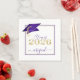 Personalised CLASS OF 2025 graduation party napkins with your graduate's name in an elegant calligraphy script shown with a faux metallic purple foil graduation cap and faux gold foil 2025 with a purple and gold border and purple text. ASSISTANCE: For help with design modification or personalisation, colour change, transferring the design to another product or you would like coordinating items, contact the designer BEFORE ORDERING via the Zazzle Chat MESSAGE tab below or email makeitaboutyoustore@gmail.com.
