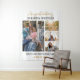 Photo collage gold script graduation party photo booth backdrop for the new grad. Features 4 photos of the graduate, and the word "Congratulations" is set.