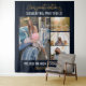 Photo collage gold script graduation party photo booth backdrop for the new grad. Features 4 photos of the graduate, and the word "Congratulations" is set. Add their name, school college, and class year of graduation by clicking the "Personalise" button.