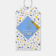 Creative graduation congrats gift tag and grad party favours, featuring light blue cap with a gold tassel on confetti background. Edit text to add grad's name and senior class year.