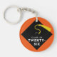 Creative graduation memento keychain keepsake gift featuring black graduation cap and gold tassel on orange background. To customise edit text to change senior class year.