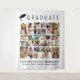 Modern white graduation party photo booth backdrop to celebrate the graduate featuring "Graduate" across the top in large typography, a grad cap, a 30 photo collage to commemorate their family, friends and achievements, and their name, class year and school..