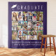 Modern purple graduation party photo booth backdrop tapestry with "GRADUATE" in large white typography next to a white illustration of a graduation cap, a thirty photo collage to commemorate his or her family, friends and achievements, and his or her name, class year and school in white typography.