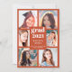 Send your family and friends a modern personalised photo collage graduation card to wow them. This modern template design features six photos for you to change to your own framed in burnt orange. In the centre in white typography is the word "Grad" with the year, your name and school to personalise. The back of the card is orange. Designed by Susan Coffey.