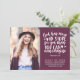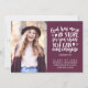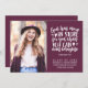 Announce your high school graduation to your family and friends in style with this modern Christian photo announcement card.This design template features your photo on the left and on the right is a bible verse in a modern white script typography that reads "God has more in store for you than you can even imagine. Ephesians 3:20" with your class/year, name, school name, and date for you to personalise on a purple background. Back of the card is purple. Congrats on your graduation! Designed by artist Susan Coffey.