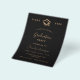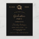A modern, elegant graduation party invitation. A black background decorated with a gold cap. Personalise and add a name, year and details. Golden letters.