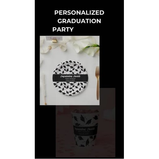 Black and white graduation party, black graduation caps thrown in the air for both him and her. Nice graduation party black and white paper goods for a celebrations for a graduate from a high school, college, or university with school colours of black and white.