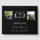 A classic black background. White coloured text. Personalise and add 2 photos, name, school name and year. For both him and her. The name on the front is written with a hand lettered style script. Decorated with a faux silver looking laurel wreath and a cap.