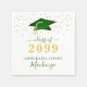 Elegant personalised green and gold graduation party paper napkins featuring a green graduation cap, gold confetti, fancy script typography and class year with CONGRATULATIONS and your graduate's name. ASSISTANCE: For help with design modification/personalisation, colour change, transferring the design to another product or would like coordinating items, contact the designer BEFORE ORDERING via Zazzle Chat or makeitaboutyoustore@gmail.com.