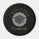 A magnet which says Class of 20xx and the graduate's name, written in a gold colour. Designed with a black graduation cap surrounded by a semi-transparent white circle. Black background with gold lettering is simple yet stylish.