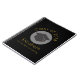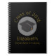 A spiral notebook which says Class of 20xx and the graduate's name and school, written in a gold colour. Designed with a black graduation cap surrounded by a semi-transparent white circle. Black background with gold lettering is simple yet stylish.