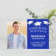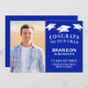 Announce your graduate's achievement with this card designed with a graduation cap toss border and text in white against an editable royle blue background colour you can change to coordinate with your photo or school colours. Personalised with their full name, photo, Class Of year and school or university. Include additional information like your graduate's plans after high school on the back or simply delete the sample text to leave the back blank. You can CHANGE THE COLOR by clicking on the CUSTOMIZE FURTHER tab. Contact the designer via Zazzle Chat or makeitaboutyoustore@gmail.com if you'd like this design modified, on another product or would like coordinating items.