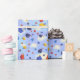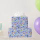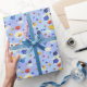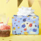 Colourful graduation caps are tossed into the air and shown against a blue sky with puffy clouds.  Perfect for wrapping graduation gifts!