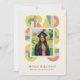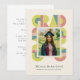 Retro-style, yet modern, graduation announcement photo card invitation that features the word "GRAD" designed with geometric shapes in various colors that form a border around the photo of the graduate. Retro colors—green, dusty pink, brown—add to the card's retro style.