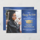 If unexpected circumstances have caused a postponement or cancellation of your graduation party, inform family and friends of the change in plans with these modern royal blue and gold save the new date postcard invitations. All photos and text are simple to customise. Design features a blue faux brushed stainless steel background, gold faux metallic foil graduation cap, and handwritten style script calligraphy. Template includes stylish typography graduate name, class year and school, and one photo of your choice, such as a senior picture or image from the commencement ceremony. Please note that gold is printed colour, not metallic foil. This elegant graduation announcement card is a stylish and chic way to begin your special day celebration and new invite guests to resave the new rescheduled date. For a unique finishing touch, address postcard with a gold ink pen. Congratulations to the graduate!