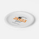 This personalised paper plate is perfect for any graduation party. The orange and black text reads: Class of 2025 Grad. A black mortarboard sits on top of the zero in the year.