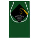 Graduation gift bag featuring creative black and gold cap design and congratulations line on a green background. To customise edit text to add name of your favourite senior class grad.