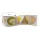 Retro-style graduation gift wrapping ribbon that features the word "GRAD" designed with geometric shapes in various colors. Retro colors—yellow, pink, brown, and green—add to the retro style.