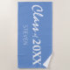 Surprise a high school graduate with a modern design personalised beach towel. This towel is designed with a customisable light blue background and big white lettering. The front side has "class of" followed by the graduation year and name. Click personalise template option and enter year and name. CLICK PERSONALIZE TEMPLATE OPTION AND FOLLOW PROMPTS