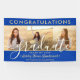 Add an elegant personalised touch to college or high school graduation party decorations with a custom 3 photo collage banner. The pictures and all wording on this template are simple to personalise, and colours are easy to change with the Zazzle design tool. The royal blue, white and gold design features a faux foil mortar board cap, trendy handwritten script calligraphy, chic modern minimalist typography, and three photos of your choice, such as senior pictures or images from the commencement ceremony. Please note that gold is printed colour, not metallic foil. This large graduation party sign can be hung on a wall to welcome guests to the celebration or used as a fun and stylish photo booth backdrop. Congratulations to the graduate!