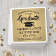 Add an elegant personalised touch to college or high school graduation party decorations with these custom black and gold paper napkins. All text is simple to customise. Design features a gold faux brushed stainless steel background, black mortar board cap, stylish modern typography, and handwritten style script calligraphy. Please note that gold is printed colour, not metallic foil. Congratulations to the graduate!