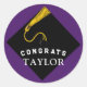 Purple graduation gift stickers and party favour labels design featuring black graduation cap with gold tassel. Edit text to add graduate's name.