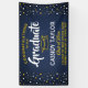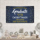 Add a personalised touch to college or high school graduation party decorations with this custom navy blue and gold yellow banner. All text is simple to customise to include name, class year, school, degree, honours, inspirational quote, or other text of your choice. Design features a mortar board cap, festive confetti dots, stylish modern typography, and handwritten style script calligraphy. Please note that gold is printed colour, not metallic foil. This party sign is an elegant way to celebrate the special day. Congratulations to the graduate!