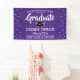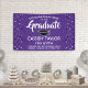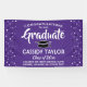 Add a personalised touch to college or high school graduation party decorations with this custom purple, white and black banner. All text is simple to customise to include name, class year, school, degree, honours, inspirational quote, or other text of your choice. Design features a purple background, black mortar board cap, festive confetti dots, stylish modern typography, and handwritten style script calligraphy. This party sign is an elegant way to celebrate the special day. Congratulations to the graduate!