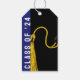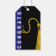 Creative graduation congratulations gift tags, featuring black cap with gold tassel on a blue background for high school and college grads. Edit text to add year. Add grad's name to further customise.