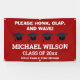 Add to a graduate's graduation festivities during Coronavirus times with this please honk and wave congratulations red banner! If you can't have a graduation party, then have a car parade! Personalise with the graduate's name, graduation year, school name, or other custom messages.