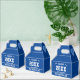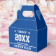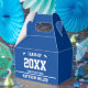This deep blue and white favour box says 'Class of 2023' in large white text. (You can change the year if necessary.) At the bottom, there's white display text you can change to show the correct name for the graduate. White graduate's caps are on either side of the phrase "Class Of". You can also edit the custom message for your guests. (Shown: Thank You For Coming)