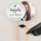 Celebrate your grad, stay cool and save your graduation ceremony seat all at the same time! The front side of this awesome fan features a your grad's name, class of year, school name and a faux gold glitter grad cap framed by a mint green background. The backside features your grad's photo. Use to save a row of seats for the big day - or perfect for fanning yourself on a hot graduation day. Assembly required or choose already assembled. Please email colorfulgalshop@gmail.com if you'd like help changing the background colour.
