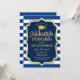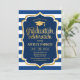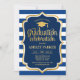 Graduation party invitation for men or women. Elegant invite card in navy blue, white and gold. Modern simple design featuring stripes, a cap, faux glitter gold and typography script font. Perfect for a stylish graduation celebration.