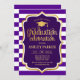 Graduation party invitation for men or women. Elegant invite card in purple and gold. Modern simple design featuring stripes, a cap, faux glitter gold and typography script font. Perfect for a stylish graduation celebration.