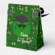 Graduation Confetti- The background is green stars and black ribbons confetti. On the front side is a small wearing a black graduation cap and tassel. On the back side is a larger face with a text area on top. The text reads: Thanks for coming! Edit the text to say anything you like. Delete the text if it's not wanted. This design is available in assorted colours.