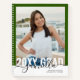 Custom Printed Personalised Graduation Party or Open House Guest Memory Book with Modern Script Name and Class Of Year Overlaid on a Senior Photo on the Front Cover – shown in green, but you can change the background border colour to match your school colours or grad party colour scheme.