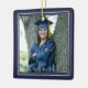 This commemorative keepsake ceramic ornament features two photos of the graduate and includes their name, school and graduation year. Makes a thoughtful gift for any graduate. NOTE: The BLUE background colour can be changed by clicking on the CUSTOMIZE tab. The silver faux glitter border accentuates most all school colours. The font style/colour/size/placement can be changed as well.