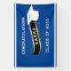 Navy blue with white border, white grad cap with diploma and blue tassel. Pretty gold and black swash for your grads name.