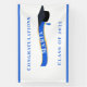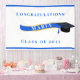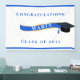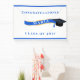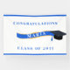 White and Royal blue border, black grad cap with diploma and blue tassel. Pretty gold and blue swash for your grads name.