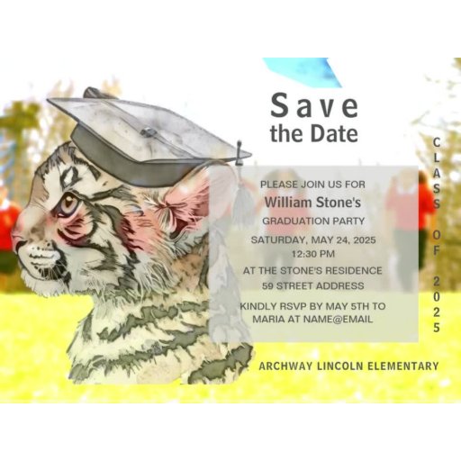 Create custom graduation name cards with three of your favourite photos. Tiger Grad Design on the front. Graduate details are on the back along with space for three photos. Use the template to personalise. Graduation Name Card with photos.