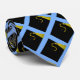 Graduation ceremony and party neck tie featuring black and gold cap pattern on light blue background.