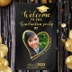 Create unique personalised graduation party welcome banner designed in black and gold colours, decorated with graduate's hat illustration and a heart shape photo in a golden yellow frame. This template design makes it easy to customise with own photo, first and last name, year, and the school name. On this design, black background slightly imitates metallic surface.