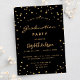 A glamourous invitation card for a graduation party for both him and her. A black background decorated with faux gold stars. Personalise and add a name and party details. The text Graduation and the name are written with modern hand lettered style script. Golden coloured text.