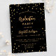 A glamourous invitation card for a graduation party for both him and her. A black background decorated with faux gold stars. Personalise and add a name and party details. The text Graduation and the name are written with modern hand lettered style script. Golden coloured text.