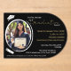 The design features an elegant oval-shaped display that showcases the graduate's photo, along with personalisation fields and graduation cap and diploma artwork—all presented in black, white, and gold. The personalised graduation party invitation adds a touch of sophistication to your milestone celebration.