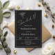 A modern and stylish black and white invitation for a graduation party. Text: She did it! Decorated with a black graduation cap. Personalize and add a name and the details.